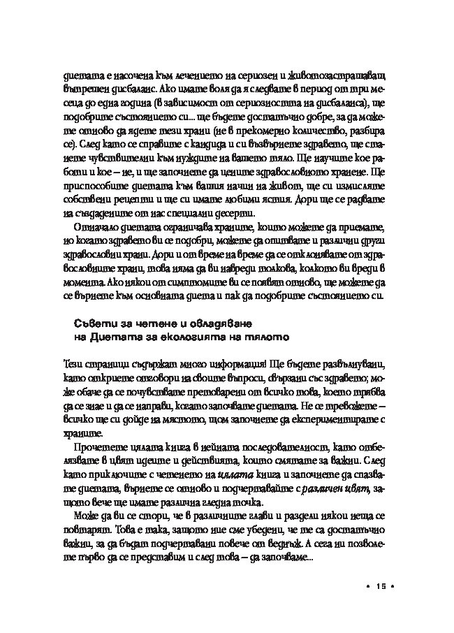 Диетата за екологията на тялото ни показва как да възстановим и поддържаме вътрешната екология, от която се нуждае тялото, за да функционира правилно, и да елиминираме или контролираме симптомите, които ни отнемат радостта от живота. Дона Гейтс ви показва стъпка по стъпка как да се храните така, че да сте по-здрави и силни – вкусно, лесно и евтино!