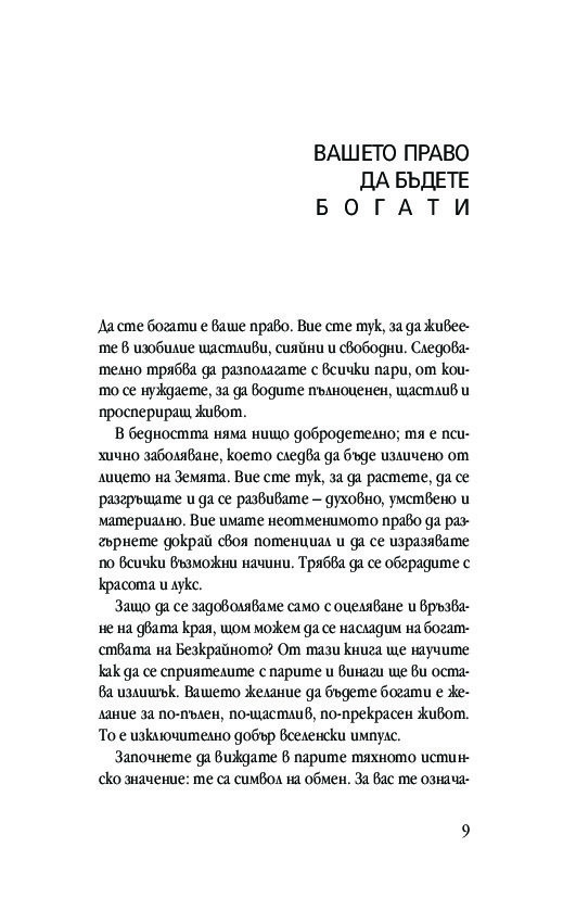 Да сте богати е ваше право. Вие сте тук, за да живеете в изобилие щастливи, сияйни и свободни. Следователно трябва да разполагате с всички пари, от които се нуждаете, за да водите пълноценен, щастлив и проспериращ живот.