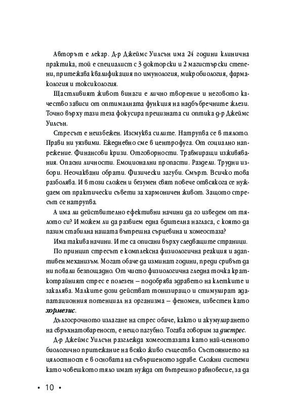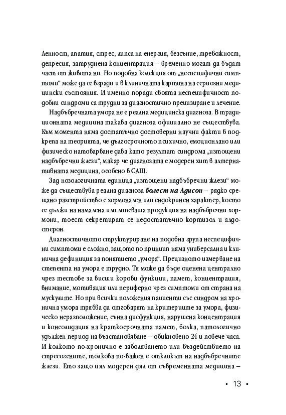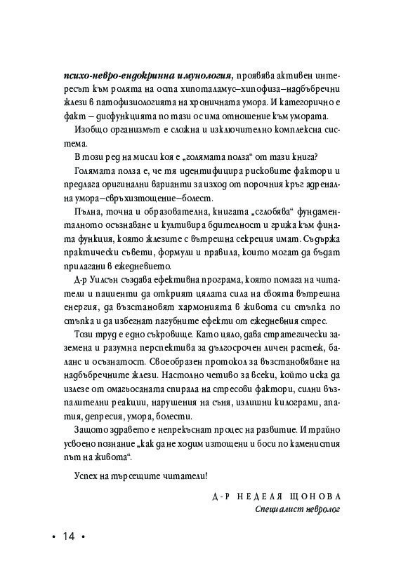 Информацията в нея обаче би била полезна и за представителите на медицинската професия, тъй като д-р Уилсън споделя своя 24-годишен практически опит за успешно третиране на пациенти с гранични форми на адренално изтощение, непопадащи в МКБ – признаваща само крайните форми: болест на Адисон (хипоадрения) и болест на Кушинг (хиперфункция на адреналните жлези).