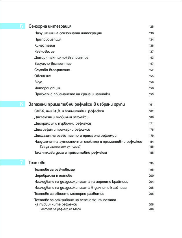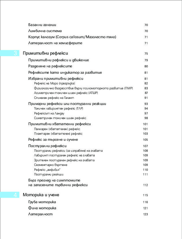 Книгата обобщава и обяснява подробно обширните проблеми на първичните рефлекси, включително здравословното психомоторно развитие на детето. Ще откриете и примерни тестове за персистиращи първични рефлекси. Това е второто, допълнено издание на книгата „Запазените примитивни рефлекси – пренебрегван фактор при проблеми с обучението и поведението“.