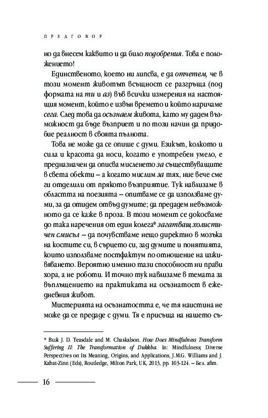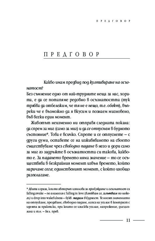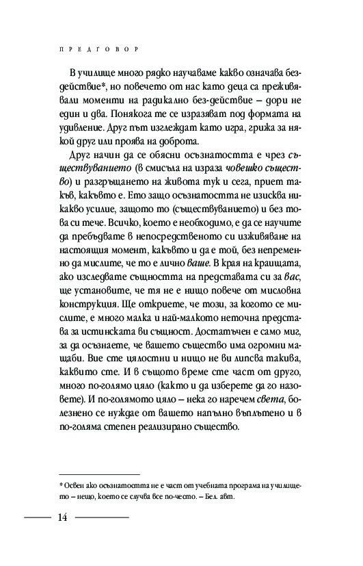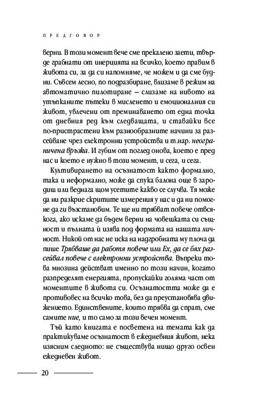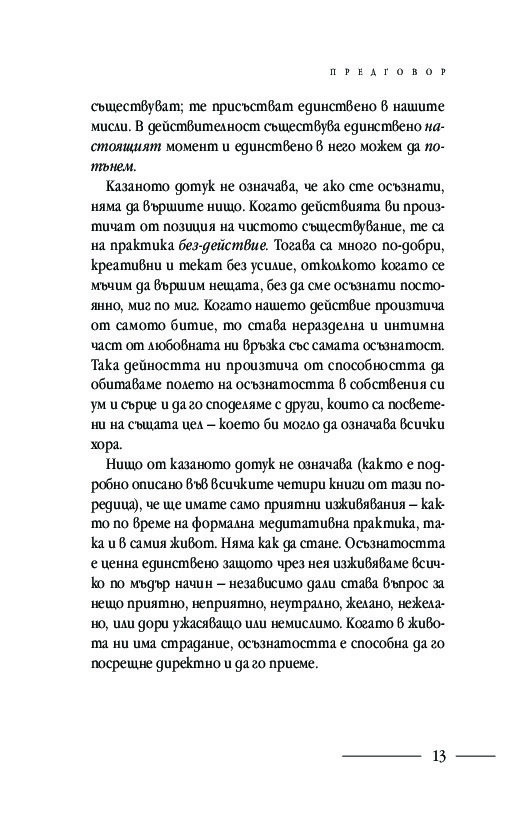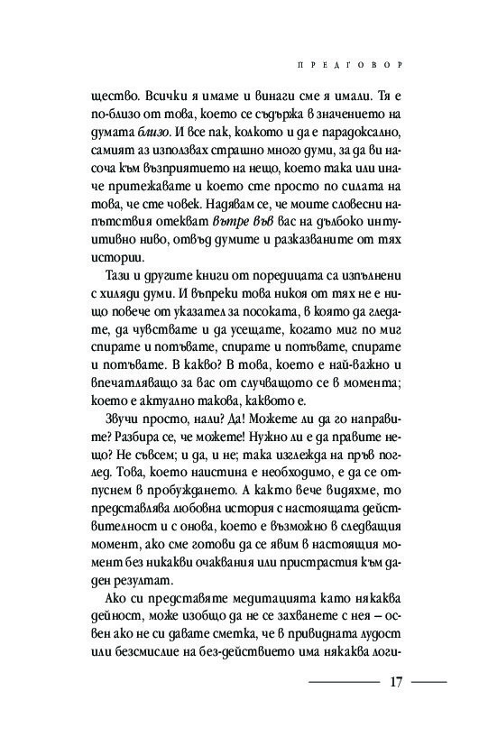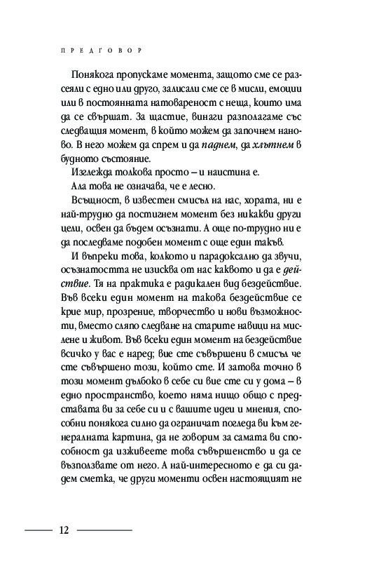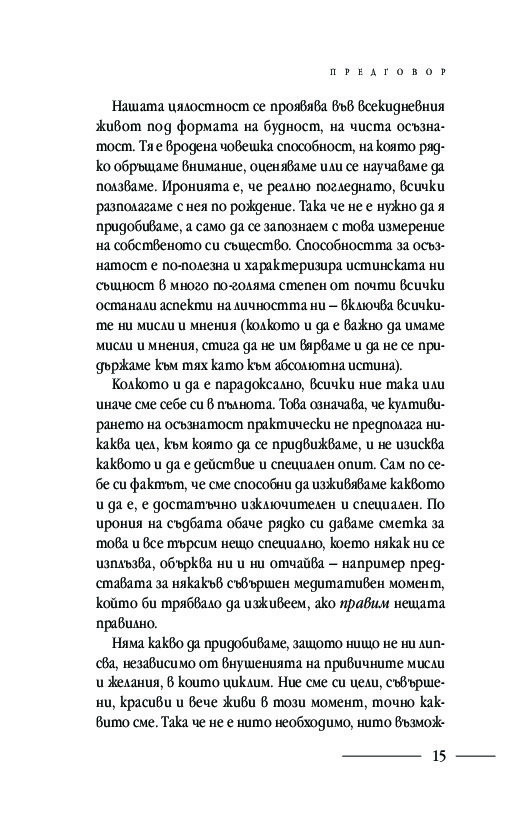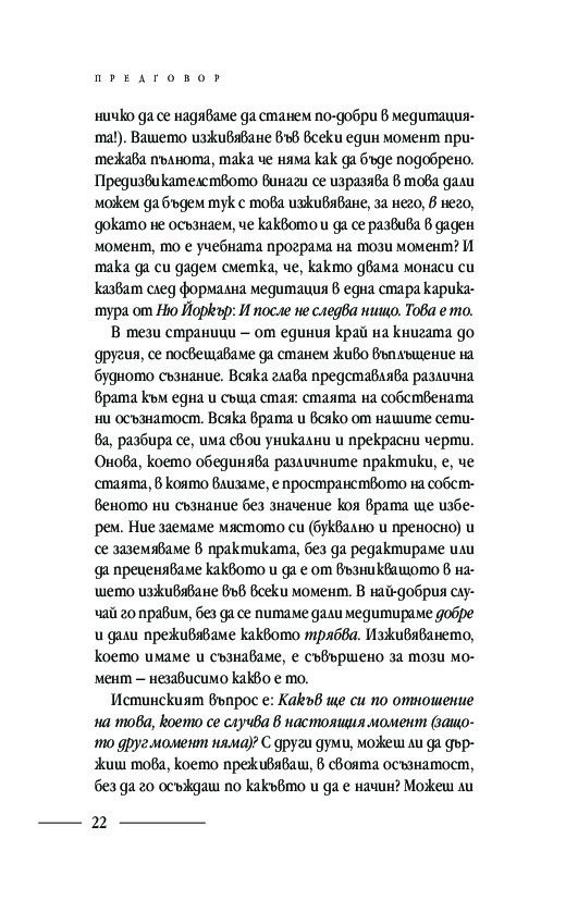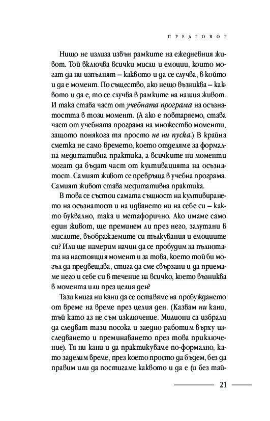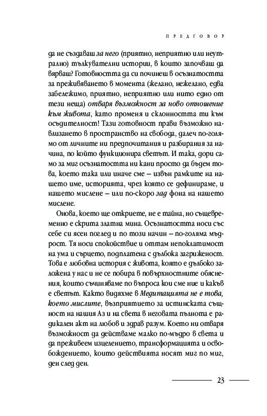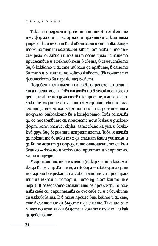 Подробните насоки и инструкции за практикуване на различни техники за медитация: в легнало, седнало и ходещо положение, както и способи от хатха йога, отварят вратите за осъзнаването на момента извън времето и препускащия делник – тук и сега. Ще научите кои са често срещаните препятствия пред практиката за осъзнатост и как да ги преодолявате