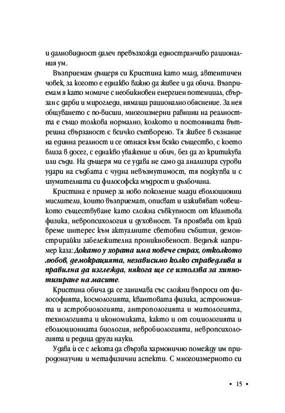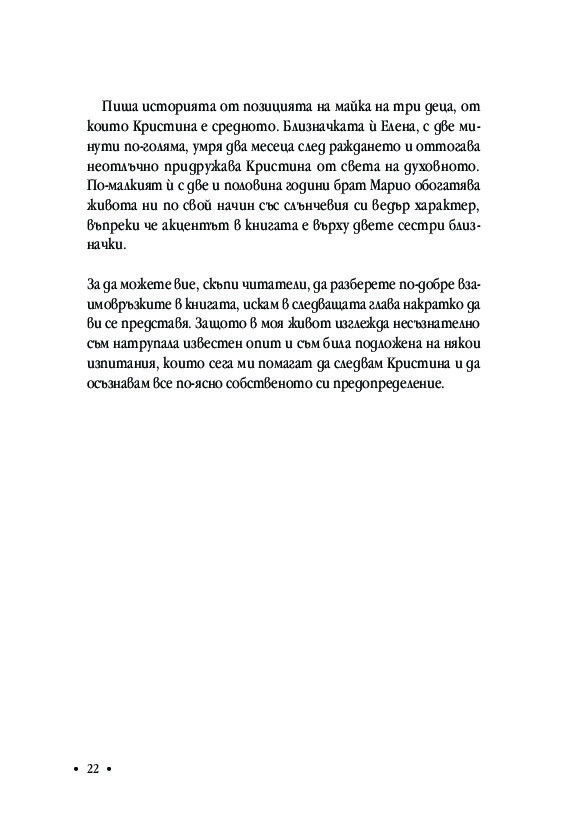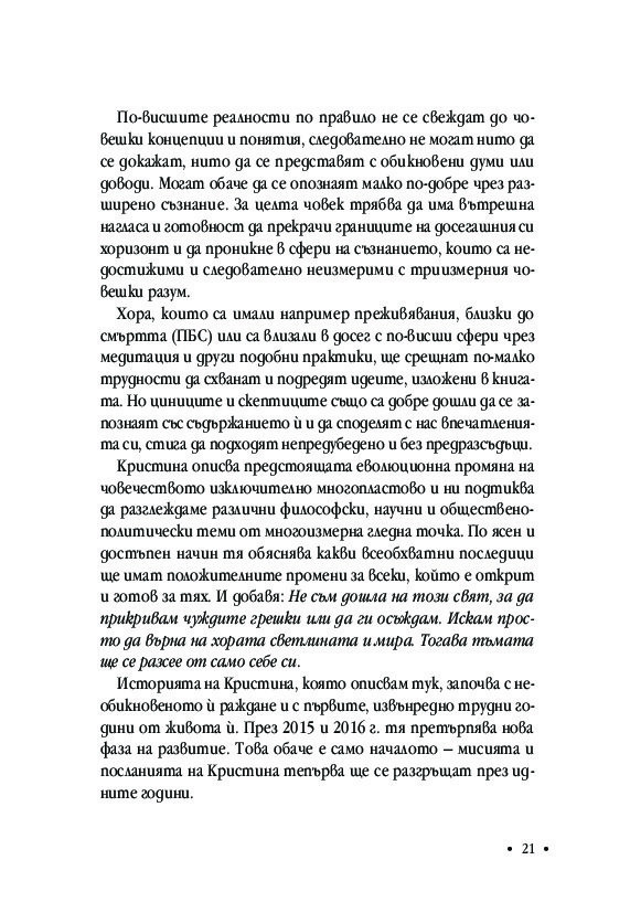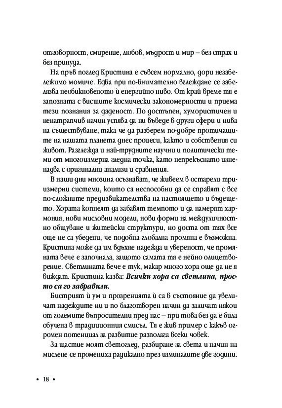 Кристина притежава забележителен поглед върху днешните световни дела и удивлява с високата си етика, както и с мъдростта и вътрешния покой, чрез които загатва за предстоящата еволюция в човешкото развитие. Като предвестник на нов етап в човешката еволюция Кристина (и близначката ѝ Елена) са се въплътили на Земята, за да разпространяват светлина и мир.