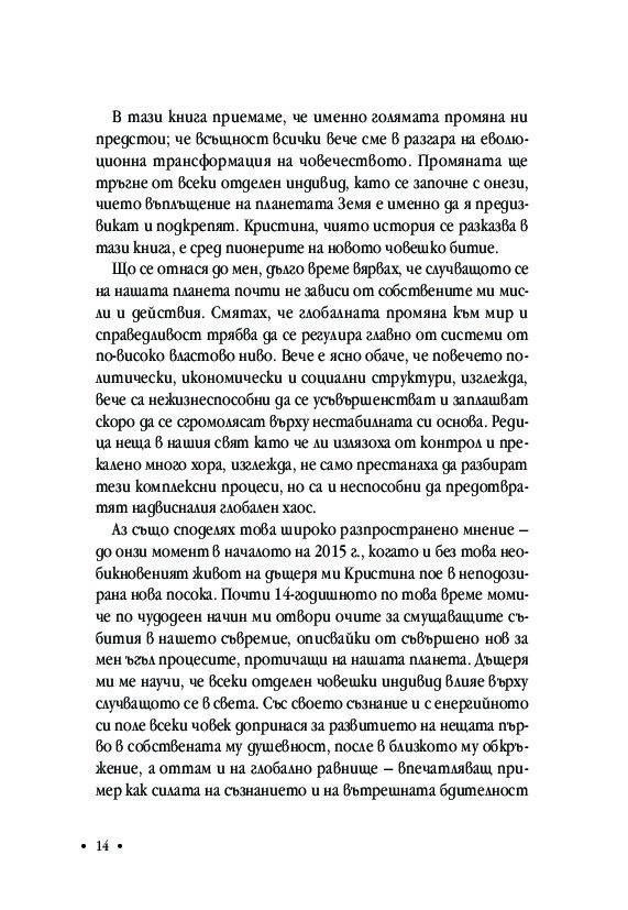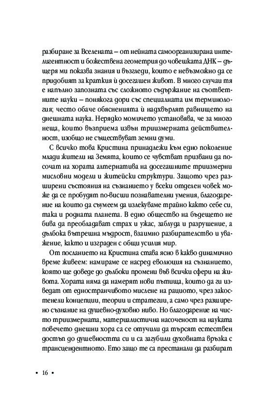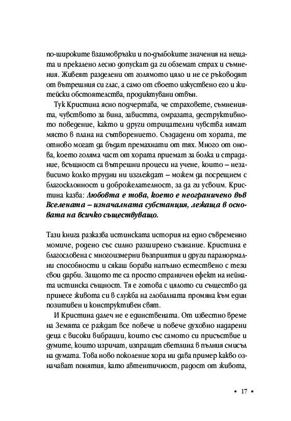 Тази първа книга от поредицата за необикновеното момиче Кристина фон Драйен разказва – през погледа на майка ѝ Бернадет – историята на необикновеното раждане, детство и юношество на Кристина до 16-годишната ѝ възраст. Майката с почуда установява необикновените парапсихични способности на своето крехко дете и се опитва да ги проумее и приеме, търсейки научни потвърждения и обяснения на чутото. Момичето се учи да овладява и обяснява с представите от триизмерната ни реалност своите невероятни способности, съзнавайки, че всичко, през които минава, е подготовка за мисията ѝ в този живот.