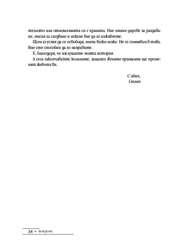 Системата на ясните принципи слага край на глада, на диетите, на този непрестанен, изтощителен, изпиващ душата цикъл в главата, който все брои калории и килограми... Бъдете Щастливи, Слаби и Свободни: това е ваше рождено право.
