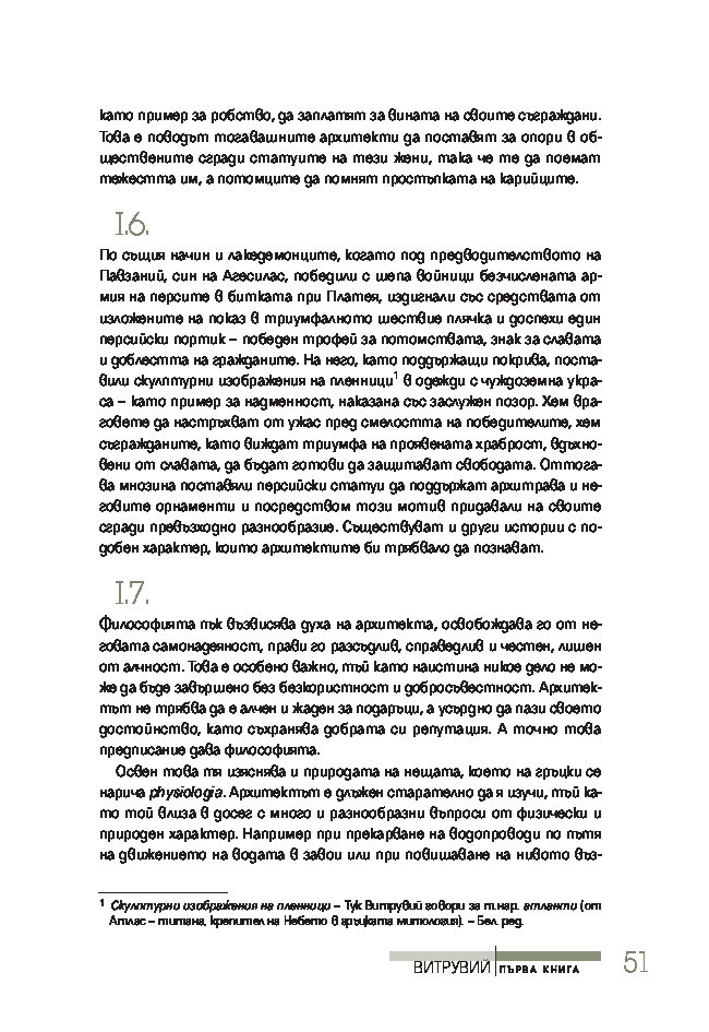 Трактатът се издава за първи път на български език, при това преведен директно от латински – най-ранния от запазените текстове на книгата. Той ще спомогне да се формира представата за античната архитектурна култура на тези, които едва сега се срещат с Витрувий, или да се освежи погледът на онези, които го познават от изданията на почти всички европейски езици.