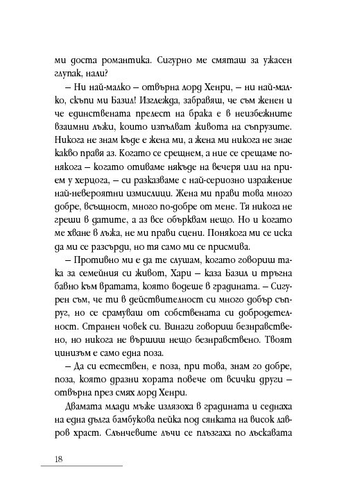 Макар в своя роман, замислен като апология на хедонизма, Оскар Уайлд да заема позата на естет и културен историк, той преди всичко си остава голям майстор на разказа. И ето че повече от век новите поколения читатели продължават да се вълнуват от вечната дилема, поставена от Уайлд в този роман: „Каква полза има човек да спечели целия свят, ако погуби душата си?“