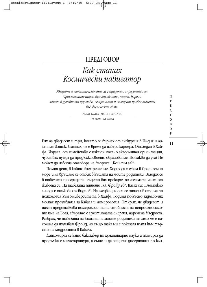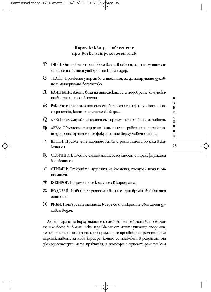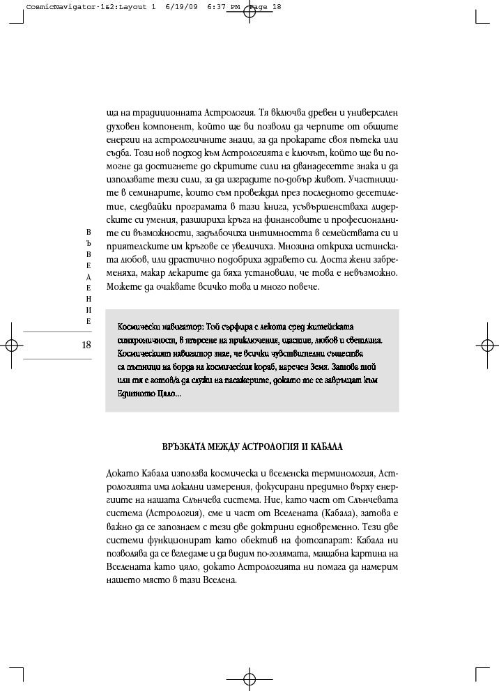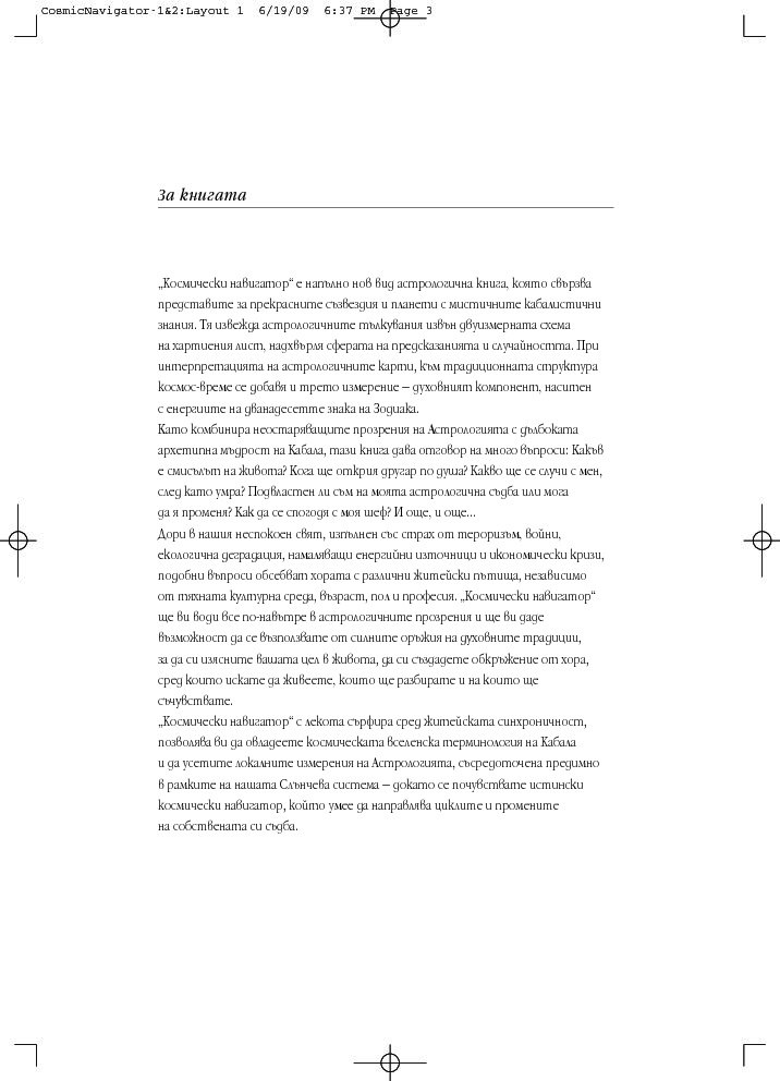 „Космически навигатор“ се различава от останалите астрологични книги. Тя свързва представите за прекрасните съзвездия и планетите с мистичните кабалистични знания и извежда астрологичните тълкувания извън двуизмерната схема на листа хартия, надхвърля сферата на предсказанията и случайността. При интерпретацията на астрологичните карти, към традиционната структура космос-време се добавя и трето измерение – духовният компонент, наситен с енергиите на дванадесетте знака на Зодиака.