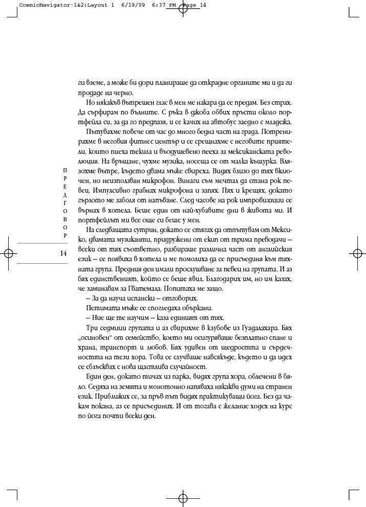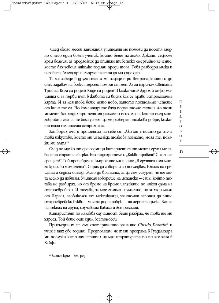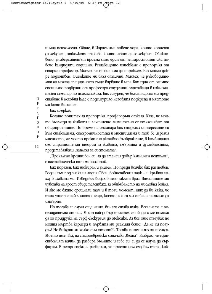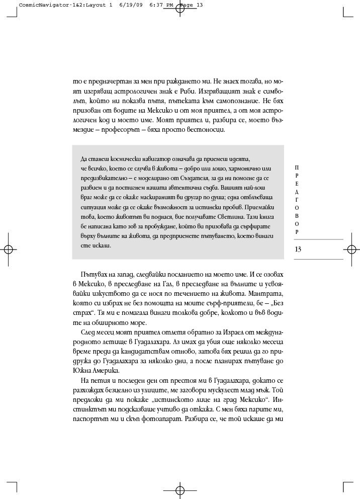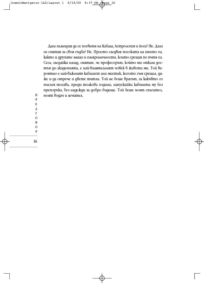 „Космически навигатор“ се различава от останалите астрологични книги. Тя свързва представите за прекрасните съзвездия и планетите с мистичните кабалистични знания и извежда астрологичните тълкувания извън двуизмерната схема на листа хартия, надхвърля сферата на предсказанията и случайността. При интерпретацията на астрологичните карти, към традиционната структура космос-време се добавя и трето измерение – духовният компонент, наситен с енергиите на дванадесетте знака на Зодиака.