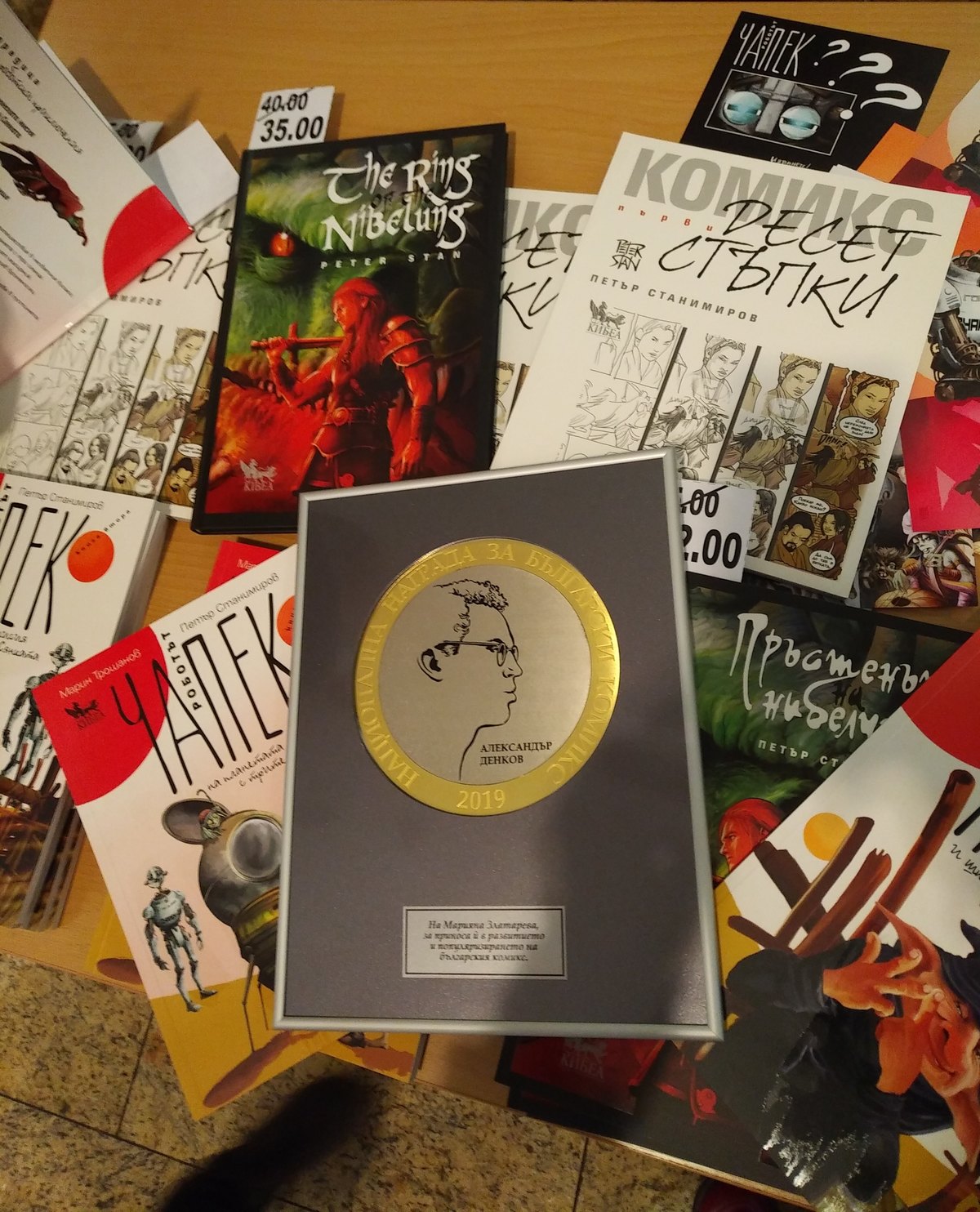 Голямата изненада на вечерта обаче поднесе втората част на артсъбитието. Марияна Златарева, управител на ИК КИБЕА, получи отличието на авторитетното жури в категорията „За принос в развитието и популяризирането на българския комикс“. Антон Стайков – художник, журналист и експерт по поетиката на комикса, зам.-председател на УС на СБХ, за избора на комисията: „Отличихме човек, който има куража да е мечтател в бизнеса на книгоиздаването и да се хвърли с главата надолу в приключението, наречено „издаване на книги за и с комикси в България“.
