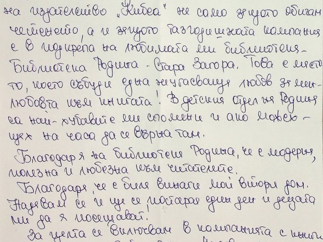 През годината, в която КИБЕА става на 30, бенефициент на кампанията ни е Библиотека „Родина“ в Стара Загора. Този избор отговаря на една от основните цели на кампанията: набиране на качествени заглавия, с които да се попълнят и обновят библиотечните фондове, така че читателите да получат достъп до съвременна и класическа литература, а и до нови издания, често не достигащи до всички региони на страната. Старозагорчани, ако предпочитате да занесете лично книгодарението си в „Родина“, там вече ви очакват.