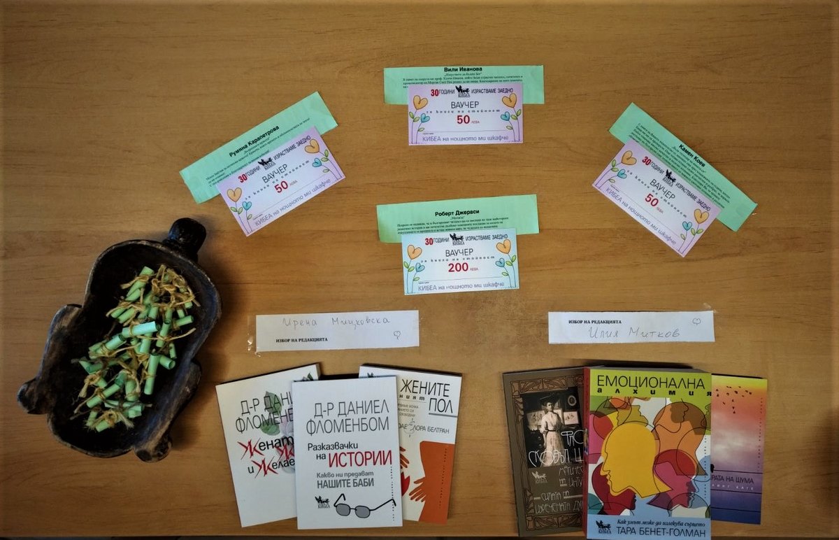 Трите утешителни награди – ваучер на стойност 50 лв. всеки, се паднаха на Камен Коев, Виолета Иванова и Румяна Карапетрова. Всеки от тях се е постарал от сърце. Благодарим на г-н Коев, който отделно ни поздрави за това, че веднага след приемането на 9 %-ната ставка за ДДС намалихме крайните цени на всичките си книги.