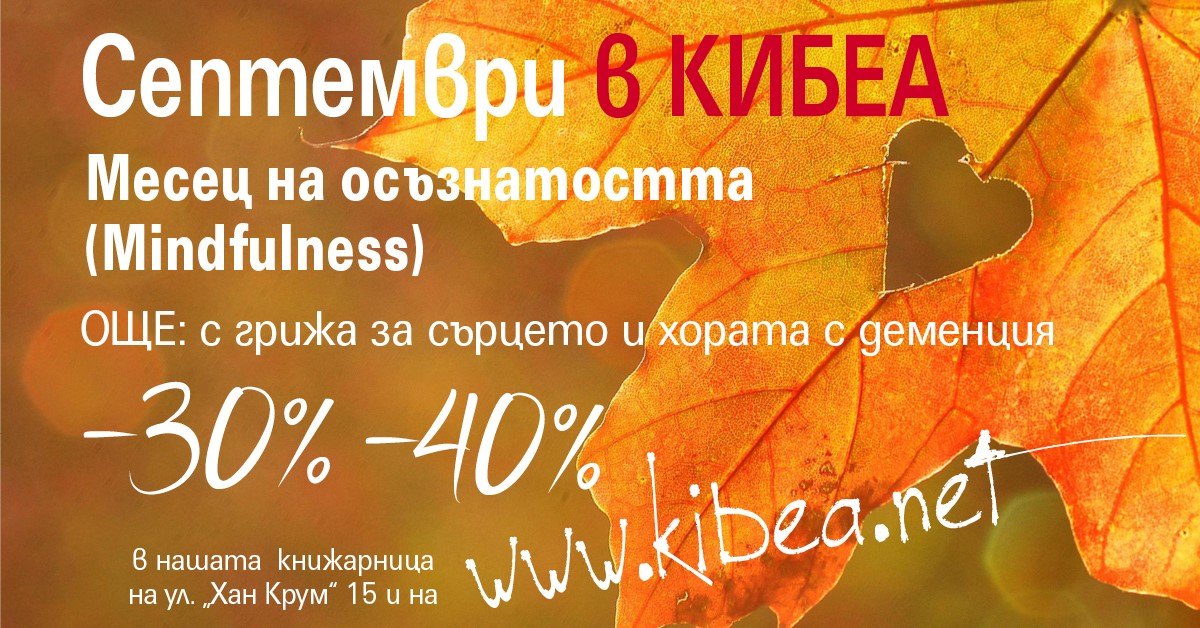 С –30% през септември са 15 ярки заглавия, сред които четирите пътеводителя на д-р Кабат-Зин за същността, начина и ползите от практикуването на осъзнатост за здравето, образованието, работата, семейните отношения, родителството и пр. (Можете да вземете комплекта от 4-те заглавия с –40%.) Подборката включва монографиите на още десетима автори с ясни послания и практически насоки за вглеждане и вслушване в себе си. (Вижте заглавията в края на новината.)