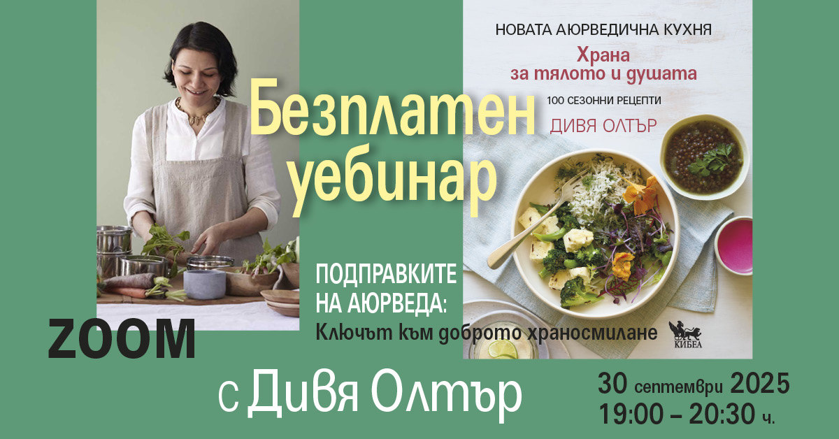 На 30 септември 2025 от 19.00 до 20.30 часа е безплатният уебинар на Дивя Олтър, експерт практик в областта на новата аюрведична кухня. Уебинарът е в Zoom и не изисква предварителна регистрация.