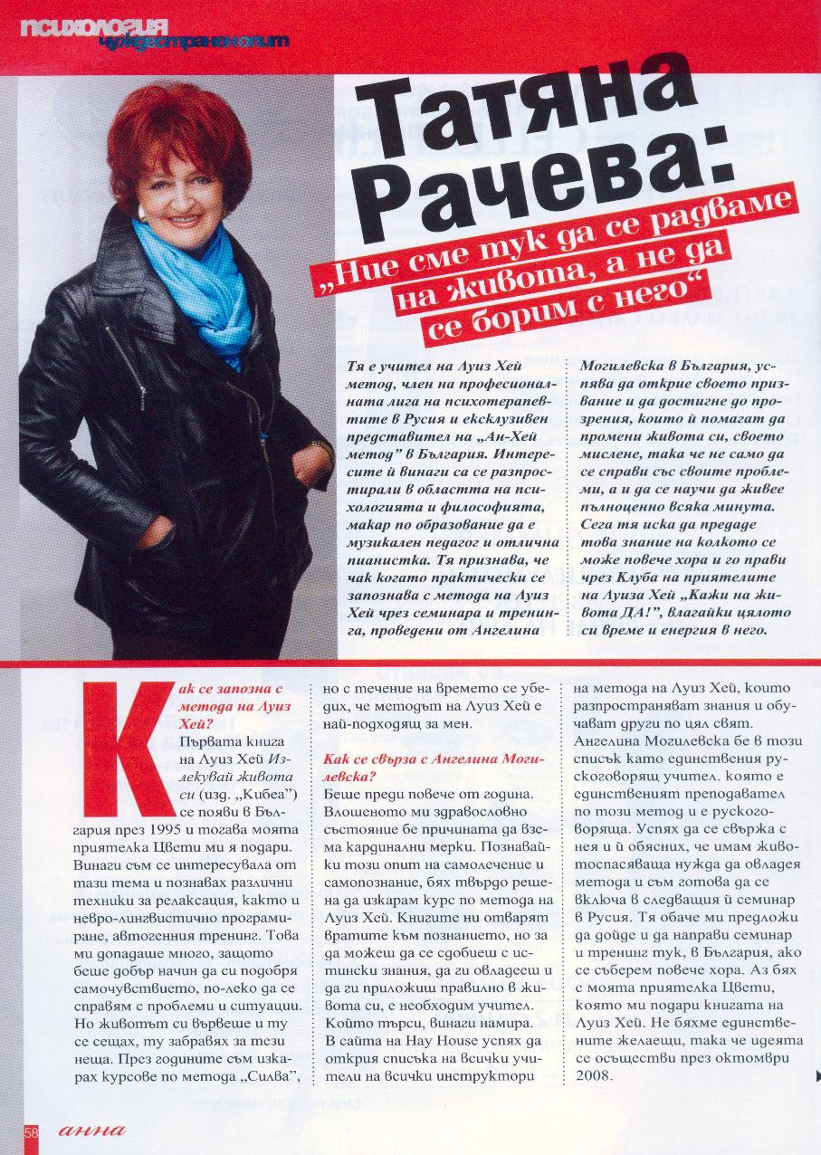 Ние сме тук да се радваме на живота (сп. АННА, 2009) Previous Next Интервю на Петя Щилиянова с Татяна Рачева