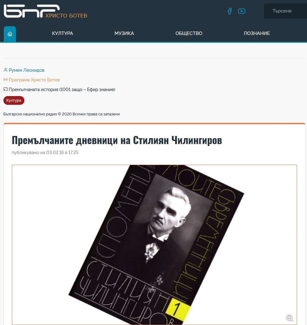 Това предаване „Премълчаната история“, чието подзаглавие е „Историята като литература, литературата като история“ е посветено на забравената и премълчана личност на Стилиян Чилингиров. Поводът е появата на изключително ценен и интересен двутомник, подготвен от Румяна Пенчева, в който са събрани голяма част от архива на „Потуленият летописец на българската културна история“.