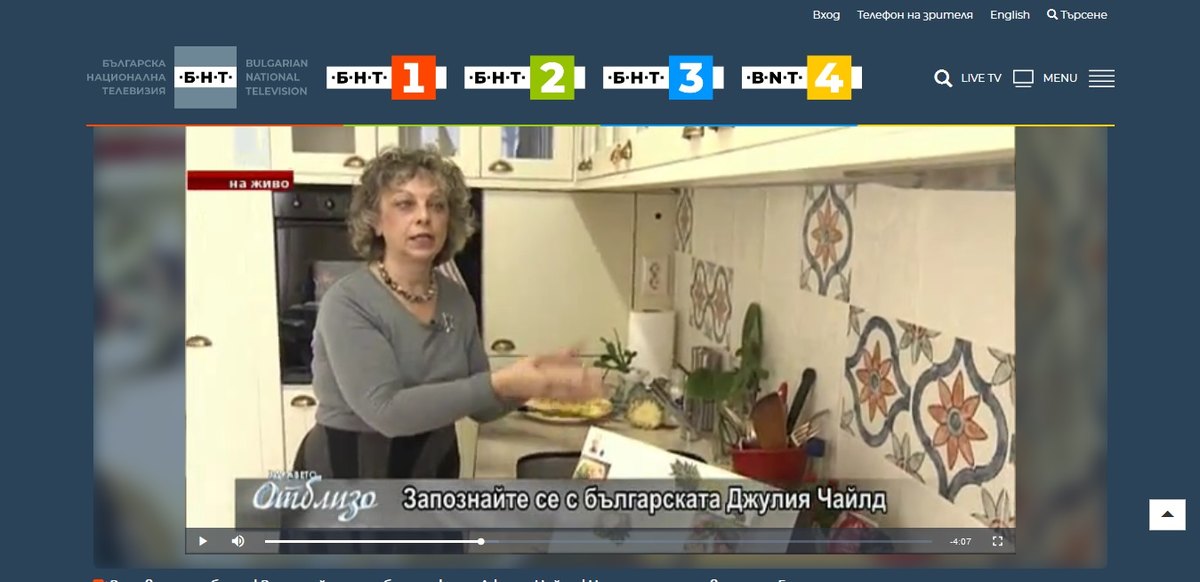 Запознайте се с българската Джулия Чайлд (БНТ, 2016) В „Здравето отблизо“ ще ви запознаем с една българка, за която готвенето е не само страст, а начин на живот! Лучия – българската Джулия Чайлд! Автор: Кристина Стамболова https://www.bnt.bg/bg/a/zapoznajte-se-s-balgarskata-dzhuliya-chajld