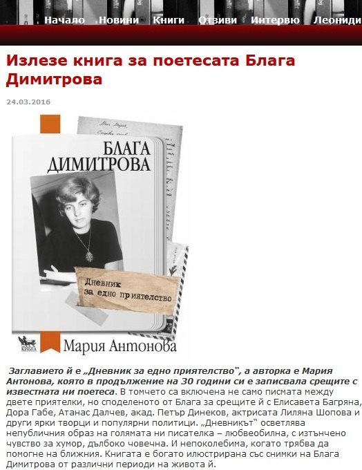 Заглавието й е „Дневник за едно приятелство“, а авторка е Мария Антонова, която в продължение на 30 години си е записвала срещите с известната ни поетеса. В томчето са включена не само писмата между двете приятелки, но споделеното от Блага за срещите й с Елисавета Багряна, Дора Габе, Атанас Далчев, акад. Петър Динеков, актрисата Лиляна Шопова и други ярки творци и популярни политици. „Дневникът“ осветлява непубличния образ на голямата ни писателка – любвеобилна, с изтънчено чувство за хумор, дълбоко човечна. И непоколебима, когато трябва да помогне на ближния. Книгата е богато илюстрирана със снимки на Блага Димитрова от различни периоди на живота й.