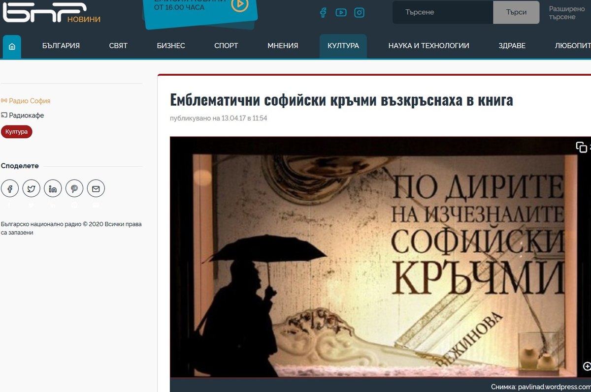 Емблематични софийски кръчми възкръснаха в книга (БНР, 2017) Гергана Пейкова и Данаил Конов разговарят с автора на По дирите на изчезналите софийски кръчми - Павлина Делчева-Вежинова. https://bnr.bg/post/100819782/emblematichni-sofiiski-krachmi-vazkrasnaha-v-kniga